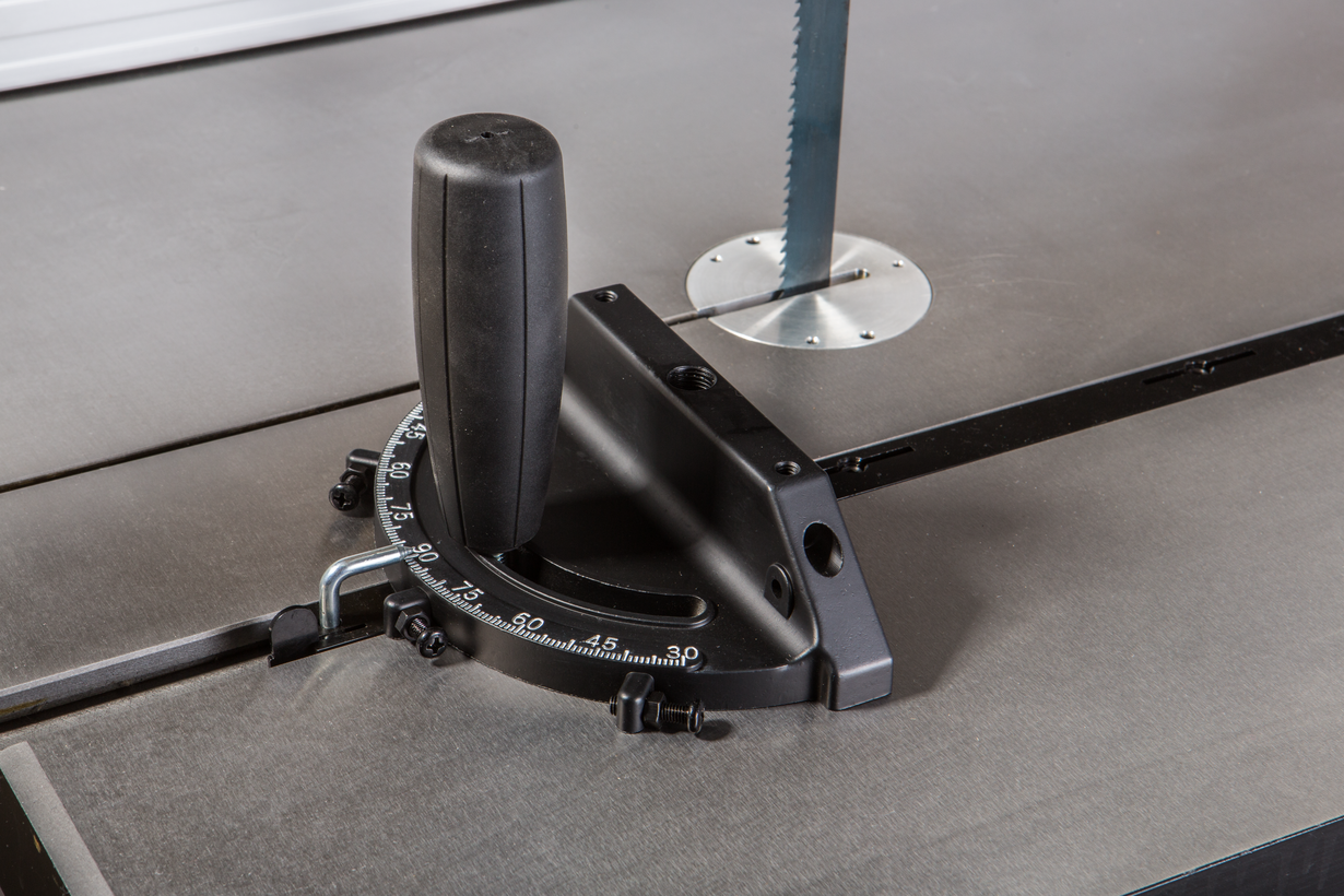 В комплекте со станком идёт несколько упоров для подачи заготовок. Во-первых, параллельный. Он выполнен в виде алюминиевого профиля, устанавливаемого на жёсткий стальной кронштейн, который перемещается по направляющей. Фиксацию производят движением рычага. Есть разметка и лупа для считывания миллиметровых делений. Во-вторых, это цилиндрический упор для пиления с фиксированным отступом от края криволинейной заготовки. Он крепится на алюминиевый профиль. В-третьих, угловой поворотный упор с транспортирной шкалой, скользящий по столу вдоль Т-образного паза.
