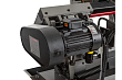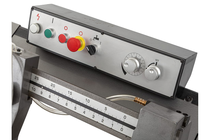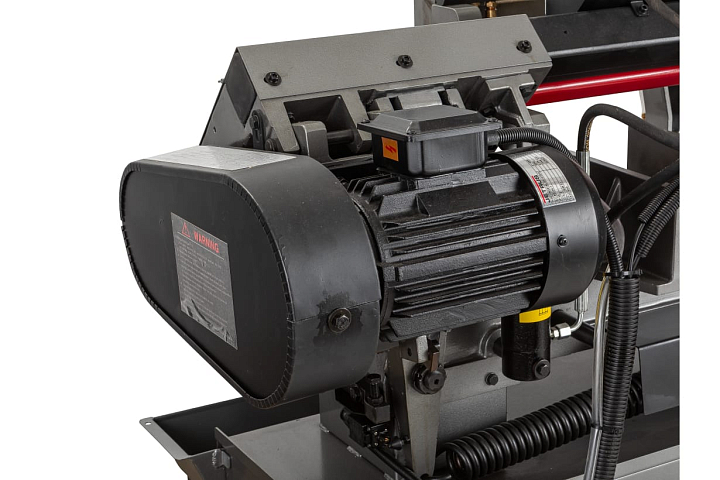 Моторная группа состоит из мощного электродвигателя - 1,5 кВт, обеспечивающего стабильную работу ленточного станка в различных скоростных режимах. Ременная передача позволяет осуществлять пиление заготовок на скоростях движения ленточного полотна в 29, 50, 73 и 95 м/мин. Управление работой станка осуществляется с пульта управления, установленного на консоли. Оборудование оснащено кнопкой аварийной остановки.