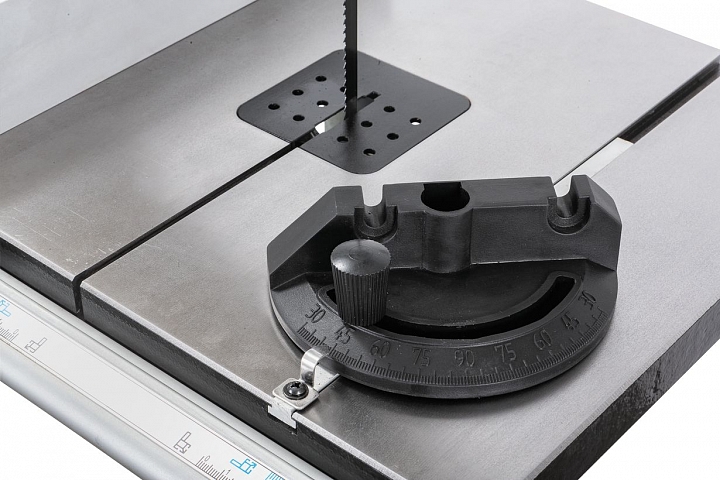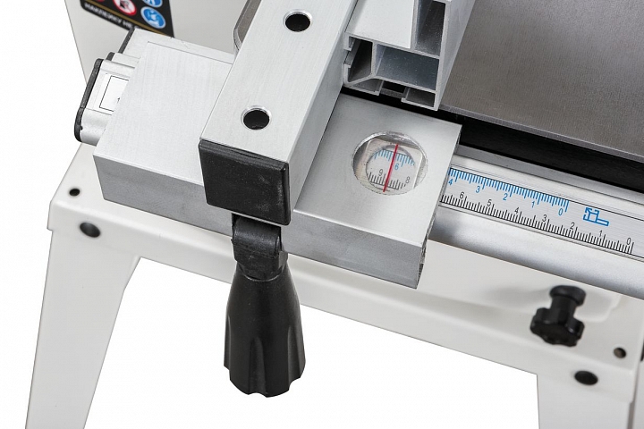 Станок оборудован регулируемым двухпозиционным параллельным упором. Он имеет две рабочие поверхности: высокую для перпендикулярных столу резов и толстых деталей и низкую для наклонного пиления и для плоских заготовок. Упор перемещается вдоль направляющего профиля с миллиметровой шкалой; для удобства позиционирования по ней, на корпусе сделан «целик», состоящий из увеличительного стекла с риской. Также в комплект входит скользящий угловой упор с направляющей вдоль Т-образного паза.