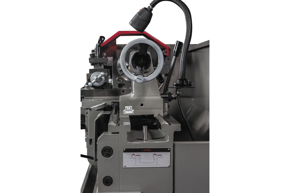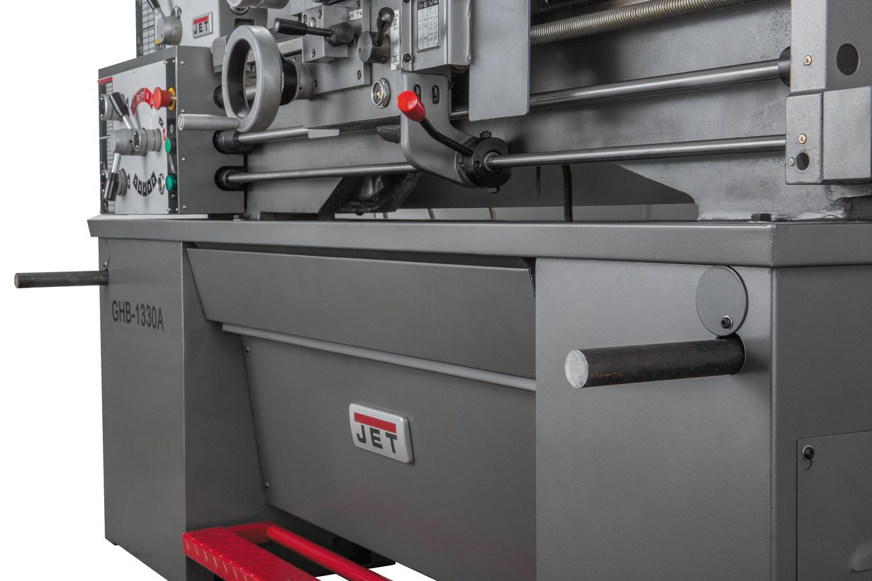 Следуя стандартам качества, компания JET оснащает свои токарные станки, включая и GHB-1330A, закаленными и тщательно отшлифованными направляющими станины, что повышает точность обработки и увеличивает срок службы оборудования. Шестерни передней бабки также закалены и отшлифованы. Их придется менять только лишь при переходе с нарезания метрической резьбы на дюймовую. С целью обеспечения непрерывного охлаждения, снижения уровня шума и увеличения ресурса механизм привода шпинделя помещен в масляную ванну. Станок оснащен механизмом автоматической подачи продольного и поперечного суппорта, а также регулируемой в поперечном направлении задней бабкой для обточки конических заготовок. Как и все станки этой линейки, GHB-1330A построен по двухвинтовой схеме: ходовой винт отвечает за резьбу, ходовой вал, отвечает за точение в автоматическом режиме. Также предусмотрен толчковый режим работы шпинделя для облегчения переключения режимов работы.