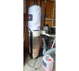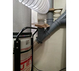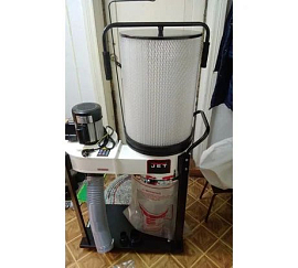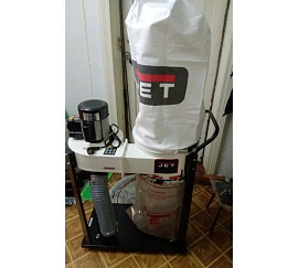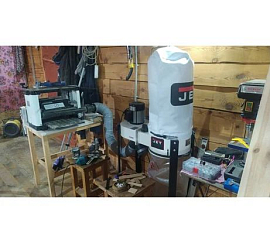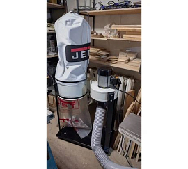 Действительно удачная модель у JET получилась. Мотор не греется, тихий, мощный, есть автозапуск. Убрал сразу тканевый мешок, так как пыль через него просачивается и оседает на всех поверхностях в мастерской, поставил картридж. Пыли вообще не стало и чистить картридж проще. Производительности на 2 станка сразу не хватает, поэтому развёл систему пылеудаления с заслонками. При уменьшении диаметра патрубков меньше 70мм падает производительность, поэтому переделал пылеудаление на всех станках под трубы 100мм.