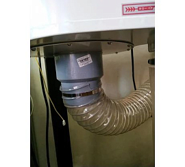 Одно из достоинств этой модели – разветвитель аспирационного патрубка для одновременного подключения двух 100-миллиметровых рукавов (они могут идти к нескольким точкам одного станка или к нескольким станкам в зависимости от необходимости). При работе с одним станком необходимо закрыть свободный патрубок, для этого предусмотрена заглушка.